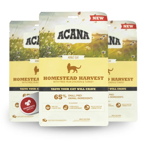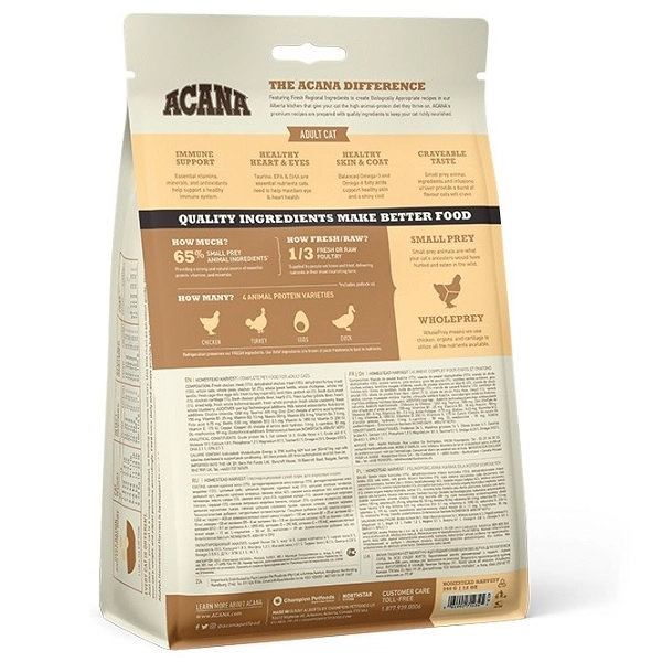 Acana Cat Homestead Harvest je kompletní krmivo pro všechny dospělé kočky. Granule obsahují maso z volně chovaných kuřat a krůt. Tuto velmi chutnou recepturu si vaše kočka jistě zamiluje!
