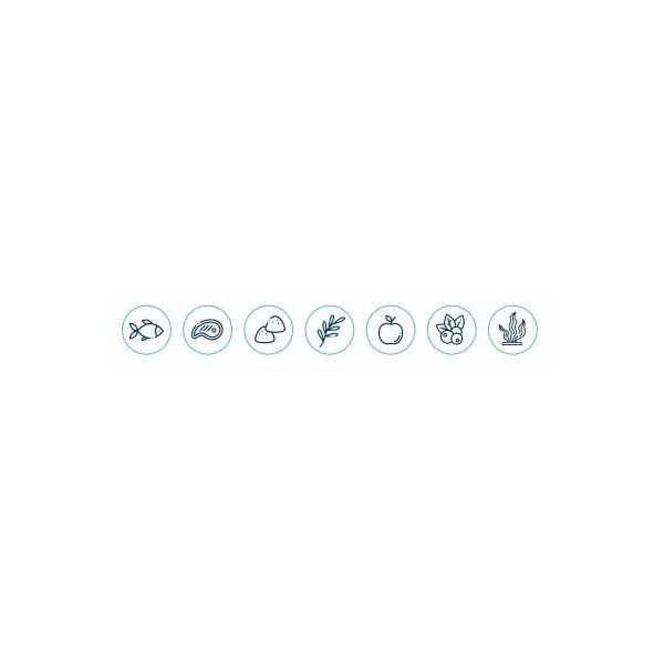 Maso (čerstvé rybí maso ze sledě 21,6 %, dehydrované hovězí maso 14 %, čerstvé hovězí maso 11,2 %, dehydrované rybí maso 4 %), rýže, hrách, drůbeží tuk, sušená jablečná dužina, řepná vláknina, hydrolyzovaný rybí protein 3 %, lososový olej, kvasnice, minerální látky, Ascophyllum Nodosum (Kelpa) PlaqueOff 0,1 %, brusinka, glukosamin, chondroitin sulfát, Yucca schidigera.