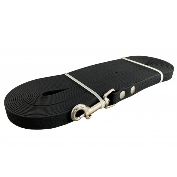Bafpet Polytrace stopovací vodítko je vyrobené z kvalitního popruhu se speciální voděodolnou úpravou, které je zároveň měkké a příjemné do ruky. Pevné nýtované spoje dodávají vodítku vysokou odolnost, takže se skvěle hodí pro střední a velká plemena psů. Ideální pro nácvik přivolání, práci na dálku i bezpečný pohyb psa v terénu a to i za deštivého počasí.