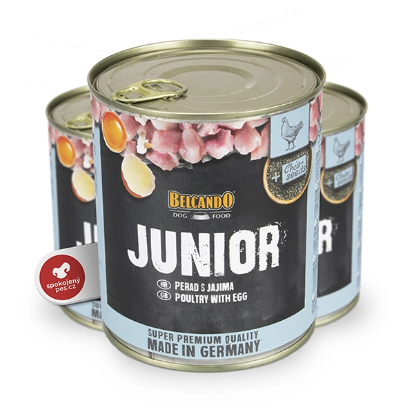 Masová konzerva Belcando Junior Poultry & Eggs určená pro štěňata všech plemen. S kuřecím masem (66 %) a vejci.