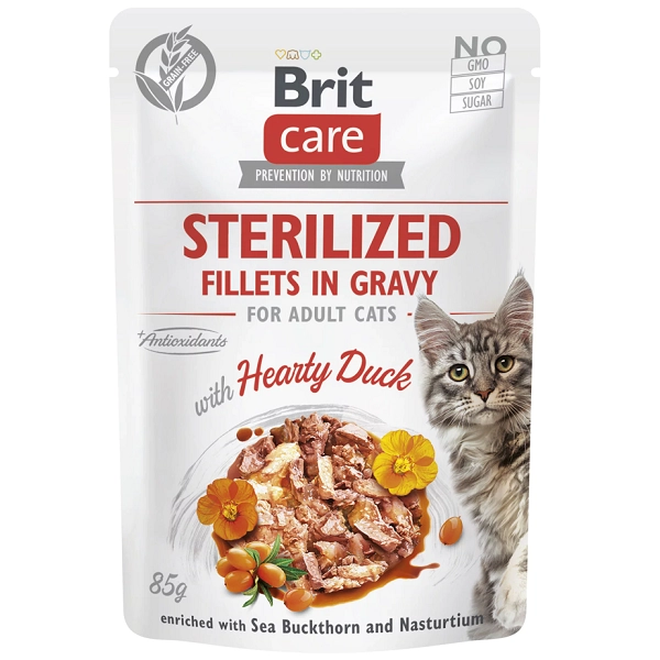 Chutné krmivo s kachnou pro kastrované kočky Brit Care ve formě kapsiček s lahodnými kousky masa ve filetech. Obsahují vysoký podíl masa a kombinaci rakytníku a lichořeřišnice pro podporu zdravého močového aparátu. Ideální i pro velmi vybíravé kočičky. Bez obilovin.