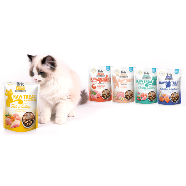Výjimečná čerstvost, neodolatelná chuť a maximální zachování živin. Mrazem sušené pamlsky Brit Care Cat Raw Treat Hair & Skin Fish & Turkey z čerstvého krůtího masa a lososa, obohacené o probiotika a rakytník, potěší všechny dospělé kočičky.