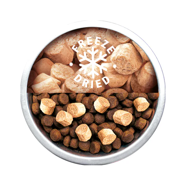 Čerstvé krůtí odřezky (70 %), čerstvé lososové odřezky (26 %), lignocelulóza (2 %), sušený rakytník řešetlákový (0,5 %), hydrolyzované kvasnice (0,5 %, zdroj inositolu a aminokyselin), inaktivované bakterie a jejich části (Lactobacillus helveticus HA – 122, 15x109 buněk/kg).