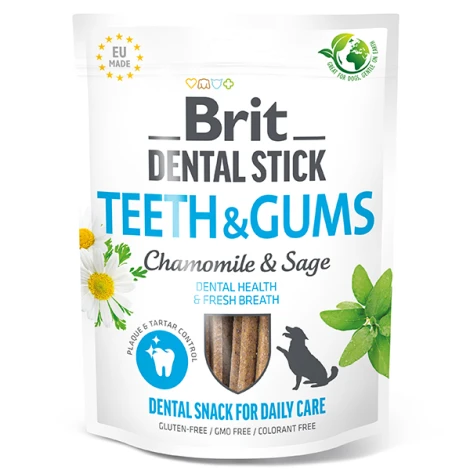 Brit Care Dog Dental Stick Teeth & Gums with Chamomile & Sage dentální pamlsky pro psy, které obsahují šalvěj a heřmánek. Pamlsky pro každodenní péči o zuby a svěží dech. Podporují dentální zdraví a tím přispívají k prevenci vzniku zubního plaku a kamene.