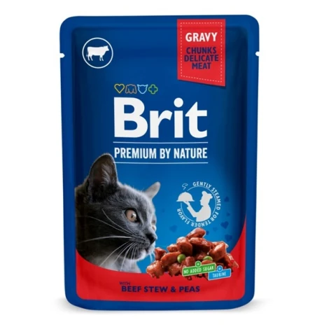 Brit Premium Cat kapsička Beef Stew & Peas 100 g - kompletní prémiové krmivo pro dospělé kočky v praktickém balení. S hovězím a hráškem v omáčce.