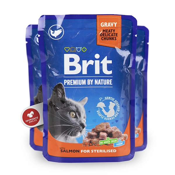 Kompletní krmivo pro kastrované kočky Brit Premium Cat for Sterilised. Recepturu s kousky lososa a lahodnou omáčkou si zamiluje každý kočičí gurmán.
