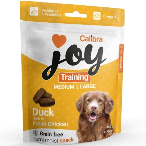 Polovlhké tréninkové pamlsky Calibra Joy Dog Training Snacks s kachnou a čerstvým kuřecím masem jsou výborně chutné, lehce stravitelné a zcela bez obilovin. Svou velikostí jsou ideální pro psy středních a velkých plemen, ale díky polovlhké konzistenci se dají snadno nalámat i na menší kousky. Pamlsky obsahují vysoké množství masa včetně čerstvého a skvěle se hodí na výcvik, sport i výchovu.