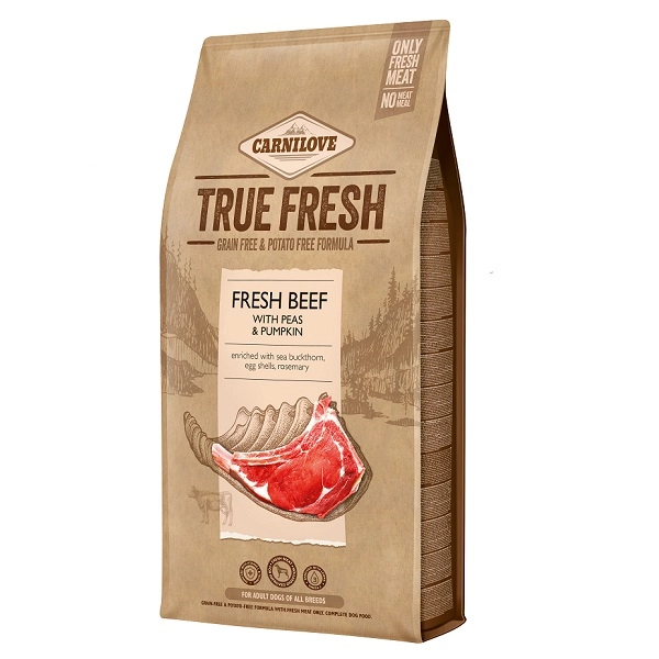 Kompletní krmivo pro dospělé psy všech plemen Carnilove True Fresh Beef Adult. Receptura obsahuje čerstvé hovězí maso a je zcela bez obilovin a brambor.