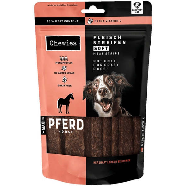 Na vzduchem sušených plátcích měkkého koňského masíčka Chewies Fleischstreifen Soft Maxi si s chutí smlsnou chlupáči každého věku – od hravých štěňat až po seniory. Tato přírodní monoproteinová pochoutka s extra dávkou vitamínu C potěší i pejsky s potravinovými alergiemi.