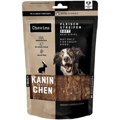 Na vzduchem sušených plátcích měkkého králičího masíčka Chewies Fleischstreifen Soft Maxi si s chutí smlsnou chlupáči každého věku – od hravých štěňat až po seniory. Tato přírodní monoproteinová pochoutka s extra dávkou vitamínu C potěší i pejsky s potravinovými alergiemi.