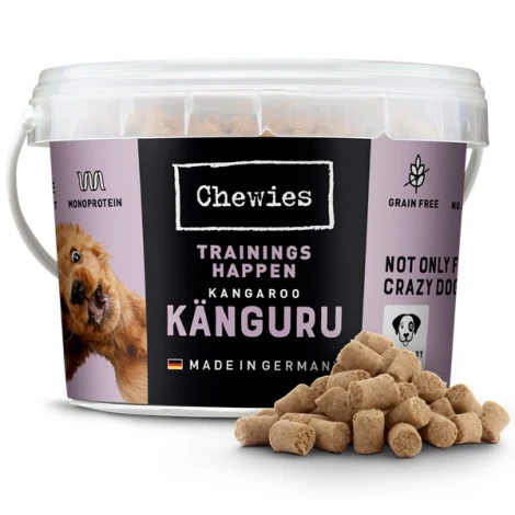 Poloměkké šťavnaté mini kousky pro psy Chewies Trainings-Happen s klokaním masem jsou tou pravou odměnou pro všechny čtyřnohé šampiony. Tyto monoproteinové pochoutky obsahují kromě masa a vnitřností také brambory, jablko, mrkev, lososový olej a bohatou směs bylinek, která jim dodává neodolatelnou vůni. Díky velikosti cca 1 cm se skvěle hodí na trénink nebo časté odměňování během dne. Jsou snadno stravitelné a vhodné i pro psy s citlivým zažíváním.