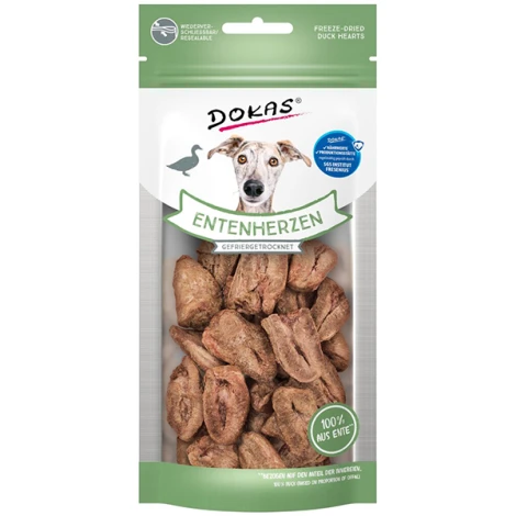 Neodolatelné pokušení v podobě lahodných mrazem sušených kachních srdíček od značky Dokas odmítne jen málokterý psí mlsoun. Tyto přírodní pochoutky jsou vhodné pro všechny chlupáče bez ohledu na věk nebo velikost.