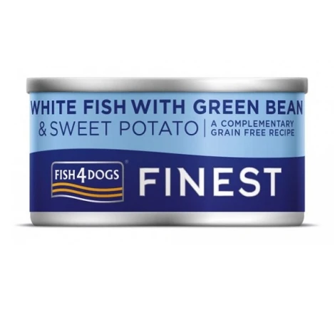 Chutná konzerva Fish4Dogs Finest pro psí milovníky ryb. Receptura s bílou rybou, sladkými bramborami a zelenými fazolkami je vyrobena z kvalitních ryb a zeleniny. Bez obsahu obilovin, přidaných umělých barviv a příchutí.