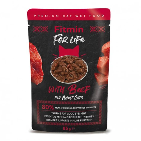 Šťavnaté masové filetky Fitmin Cat For Life s hovězím masem v husté omáčce. Kompletní krmivo pro dospělé kočky všech plemen. Obsahují až 80 % masa, taurin, vitamíny a minerály. Ideální jako hlavní krmivo, doplněk ke granulím nebo jako zpestření kočičího jídelníčku.