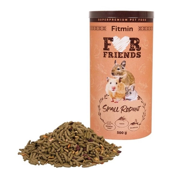 Fitmin Small Rodent For Friends kompletní krmivo obsahuje sušené kousky zeleniny a ovoce, které hlodavci zbožňují. Druhá složka krmení jsou granule, jež obsahují Yucca shidigera, která působí na detoxikaci organismu, podporuje funkci imunitního systému, činnost jater a ledvin. Granule jsou určeny pro býložravé hlodavce ke každodennímu podávání. Pro všežravé hlodavce jsou výborným doplňkem stravy, v kombinaci s přidanou živočišnou složkou, se mohou stát i hlavním krmivem. Před podáním je doporučeno ověřit si dietní nároky zvířete (hlavně u činčil a osmáků). Vždy zvířátku poskytněte dostatečný přísun čerstvé vody.