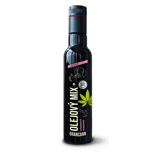 Grancann Junior olejový mix je kombinace zastudena lisovaného konopného a lososového oleje, určený pro koťata, štěňata, laktující a březí samice. Olej pomáhá rozvoji mozku a všech tělesných systémů.