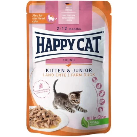 Kompletní vlhké krmivo pro koťata od 2. do 12. měsíce věku. Křehké kachní maso v lahodné omáčce Happy Cat Kitten & Junior Land Ente podpoří harmonický růst koťátka a vlastní obranyschopnost. Naskočte na spokojenou cestu za dospělostí s kapsičkou pro koťata Happy Cat.