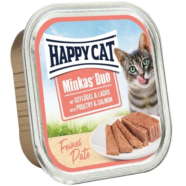 Vlhké krmivo pro kočky Happy Cat Minkas Duo Paté s mňamózní strukturou jemné paštiky lahodně kombinuje drůbeží maso s lososem, které zaujme nejednu vybíravou kočičku. Vyvážená receptura bez obilovin poskytne vše potřebné pro aktivní a zdravý život. Vhodné pro objevitele každého věku.