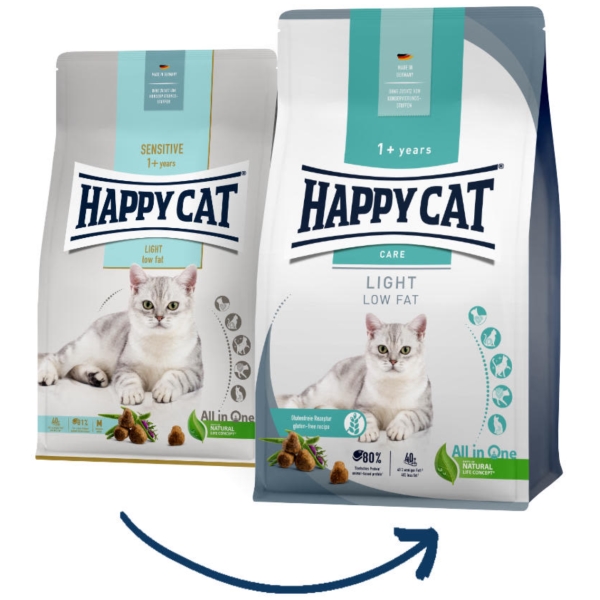 Kompletní krmivo Happy Cat Sensitive Light pro kočky s mírnou nadváhou nebo sklonem k nadváze. Receptura má vysoký obsah vlákniny pro dlouhotrvající pocit sytosti a obsahuje pouze 9 % tuku.