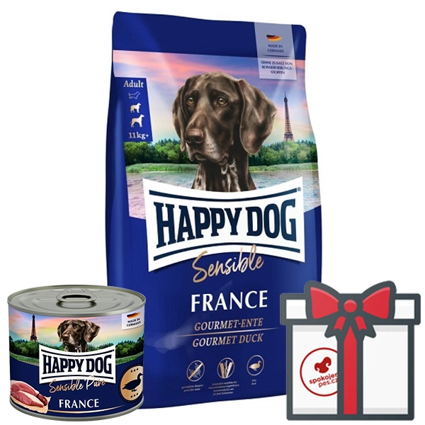 Gurmánský bezobilný zážitek s dietním kachním masem. To je Happy Dog France. Ideální volba i pro ty nejnáročnější pejsky. Lahodné krmivo pro dospělé psy středních a velkých plemen, vhodné i pro jedince s citlivým zažíváním.