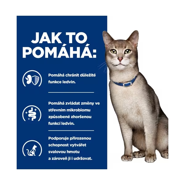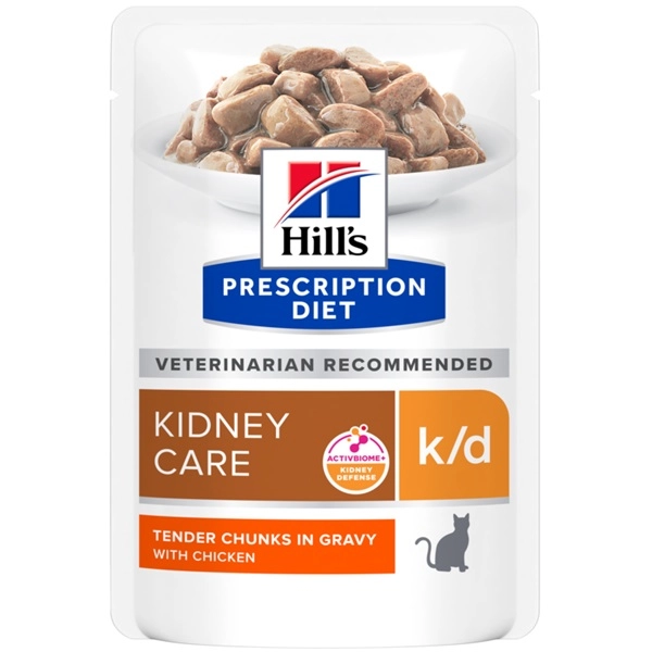 Hill's PD Feline k/d je kompletní dietetické mokré krmivo pro kočky na podporu funkce ledvin v případě ledvinové nedostatečnosti. Složení s patentovanou směsí prebiotik ActivBiome+ Kidney Defense. Ve formě lahodných kapsiček s příchutí kuřete.