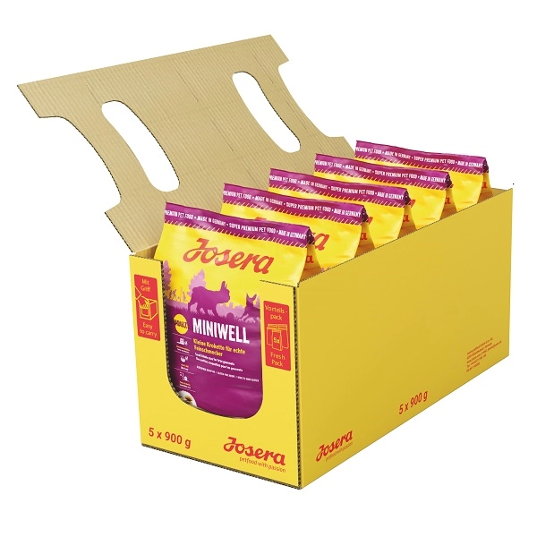 Kompletní suché krmivo Josera Miniwell s intenzivní chutí pro psy malých plemen. Receptura s obsahem vitálních látek, díky nímž granule redukují riziko tvorby zubního kamene. Bez umělých barviv, aromat, konzervačních látek a GMO.