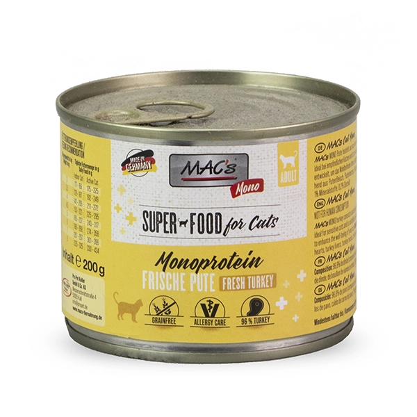 Jednoproteinová konzerva pro kočky MACs Cat Mono - jediným živočišným zdrojem proteinu je čisté maso z krůty. Pro speciální potřebu kočky s alergií nebo hypersenzitivitou na některá masa.