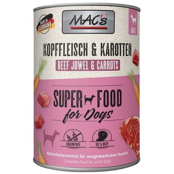 Kompletní bezobilné krmivo pro psy MACs - 65 % telecího masa, 30 % kachního masa s 5 % brambor v konzervě. Skvělá kombinace surovin, která chutná i nejmlsnějším a nejvybíravějším psům.