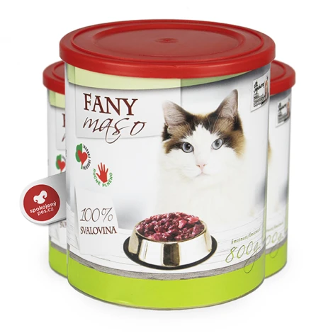 Fany je ručně plněná konzerva pro kočky všech plemen, každého věku i velikosti. Obsahuje pouze čistou hovězí a vepřovou svalovinu pokrájenou na velké kostky. Masíčko je měkké, šťavnaté a zcela přírodní.