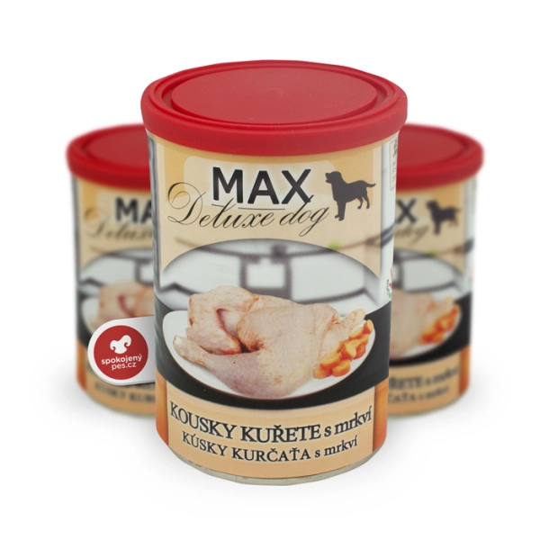 Jedinečné české konzervy Max obsahují kousky jemného kuřecího masa doplněného mrkví. 100% obsah masa, bez chemických přísad, náhražek a plnidel. Vhodné pro psy každého věku. Nejlepší masíčko, které můžete svému psovi dát.