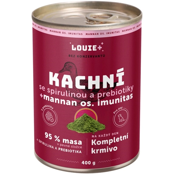 Konzerva pro psy Louie kachní se spirulinou a prebiotiky okouzlí smysly, polaská chuťové pohárky a nezatíží zažívání. Kombinaci 95 % mletého kachního masa s prospěšnou vlákninou, spirulinou a přidaných vitamínů a minerálů dovede k dokonalosti přítomnost změkčených kachních kostí s přírodním obsahem vápníku a fosforu v přirozeném poměru.