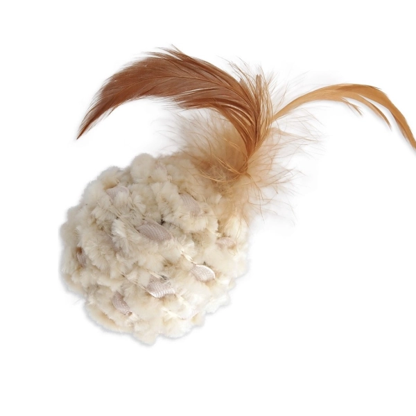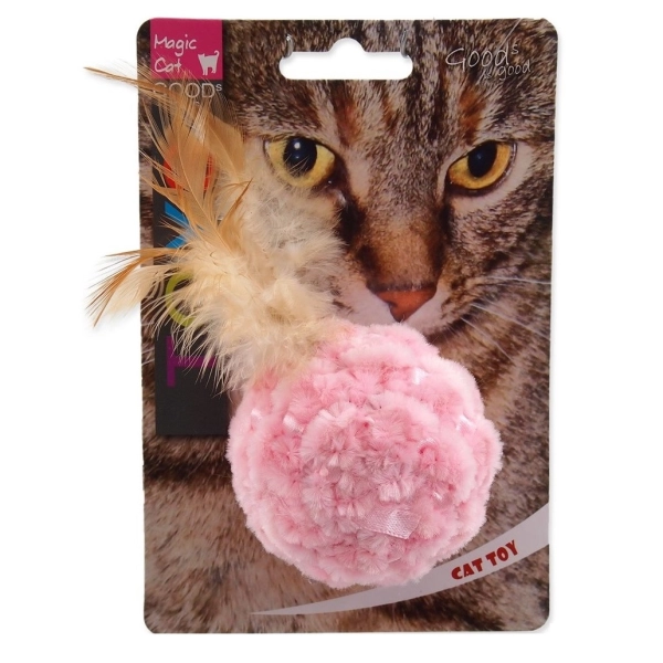 Heboučký míček Magic Cat je splétaný ze žinylky a pentle. Měkký, s peříčky a voňavým catnipem. Zábavná hračka pro kočky i koťátka, která nedělá rámus a nepoškodí drápky.