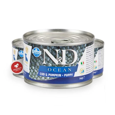 Delikatesní konzerva pro štěňátka malých plemen, kteří milují kvalitní kousky masa obohacené něčím netradičním. N&D obsahuje směs tresky, sledě a lososa, v kombinaci s dýní a krevetami. Toto krmivo může být určené k omezení intolerance určitých surovin.