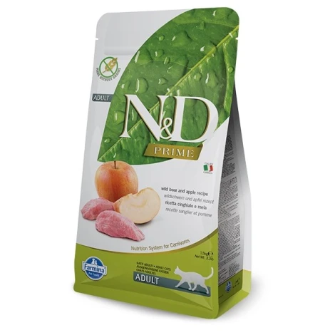 Bezobilné granule N&D Grain Free Cat Adult Boar & Apple s masem z divočáka, čerstvým kuřetem a rybami. Kompletní krmivo pro dospělé kočky všech plemen.