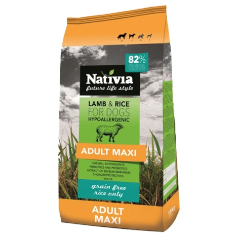 České kompletní krmivo Nativia Adult Maxi Lamb & Rice pro dospělé psy velkých a obřích plemen s citlivým zažíváním. Vynikající stravitelnost a hypoalergenní receptura - zcela bez obsahu pšenice, kukuřice a sóji. Doplněno o probiotika, kloubní výživu a extrakt z ostropestřce.