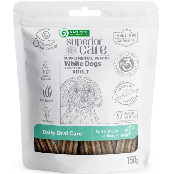 Mlsání s misí! Dentální tyčinky pro psy s bílou či světlou srstí pomohou očistit zoubky od zubního plaku a podpořit svěží dech. Nature's Protection Superior Care White Dogs Snack Oral Care s hmyzem spojují účinek mořských řas, zeleného čaje a dalších funkčních složek.