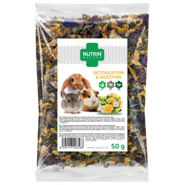 Nutrin Nature Detoxication & Digestion je doplňková směs bylinek pro králíky, činčily, morčata, osmáky a jiné býložravé savce. Jedná se pamlsek, který lze přimíchávat do sena, a nebo podávat samostatně.