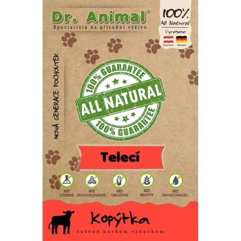 100% přírodní pamlsek Dr. Animal pro psy. Velmi šetrné a unikátní zpracování. Sušené horkým vzduchem s kyslíkem a medem. Jde o 4A výrobek, což znamená: narozen, žijící, poražen a zpracován v Rakousku.