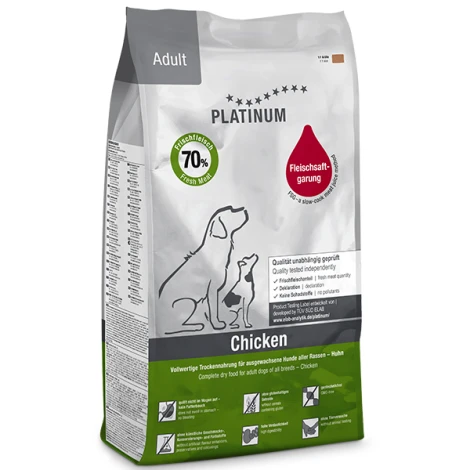 Platinum Natural Adult Chicken je poloměkké krmivo s vysokým obsahem kuřecího masa. Je vhodné pro dospělé psy všech plemen i jedince ve vysoké fyzické zátěži. Umožňuje psům dosahovat maximálního možného rozvoje kondice, především síly a rychlosti.