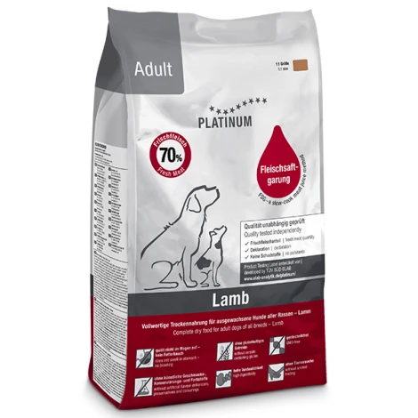 Platinum Natural Adult s jehněčím masem a rýží je superprémiové bezlepkové krmivo vhodné pro dospělé psy středních a velkých plemen. Díky svému přírodnímu a jednoduchému složení je snadno stravitelné a neobsahuje téměř žádný tuk. Obsahuje vitamíny řady A, D, E, C, železo, zinek a další důležité minerály. Toto krmivo milují psi všech věkových kategorií. Je ideální pro psy s citlivým zažíváním nebo problematickou srstí a také pro psy se sníženou pohybovou aktivitou (například po kastraci). Vhodné pro dospělé psy i psí seniory.