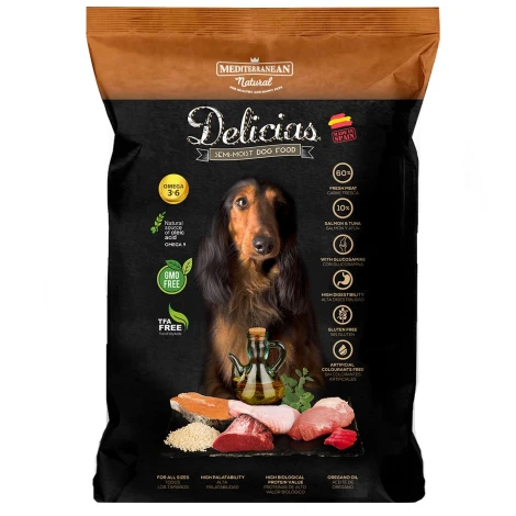 Netradiční polovlhké krmivo Delicias pro dospělé psy. Při výrobě je použito 65 % čerstvého masa a 10 % ryb. Lahodné krmivo s vysokou stravitelností, které je vhodné pro psy všech plemen. Skvělé i jako chutný pamlsek.