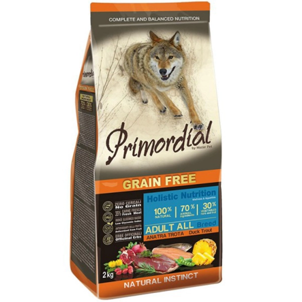 Promordial je holistické, bezobilné a vysoce stravitelné krmivo pro dospělé psy všech plemen. Jež je bohaté na proteiny vysoké biologické hodnoty. Složení s kachním masem a pstruhem, obohaceno ostropestřcem, semínky a šípky.