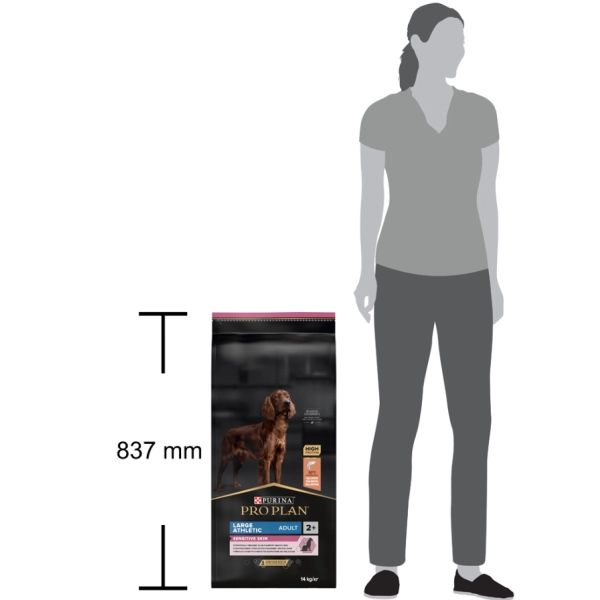 Receptura granulí Pro Plan Large Adult Athletic Sensitive Skin pro dospělé psy velkých plemen s atletickou postavou (s hmotností nad 25 kg) obsahuje speciální kombinaci živin, která je ideální pro psy s citlivou kůží a pomáhá tak omezit kožní reakce spojené s přecitlivělostí na krmivo. Hlavním zdrojem bílkovin jsou kousky kvalitního lososa, který díky svému vysokému obsahu omega-3 mastných kyselin napomáhá udržovat zdravou kůži a lesklou srst. Krmivo je zcela bez pšenice. Optimální výživu zajišťuje vysoký podíl vybraných bílkovin pro silné svaly, vitamín D a minerální látky pro zdravé zuby a dásně. Výhody krmiva řady Sensitive Skin přispívají k ideální tělesné kondici a každodennímu zdraví a pohodlí vašeho psa.