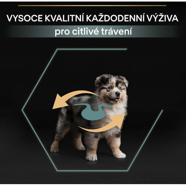 Pro Plan Medium Puppy Sensitive Digestion s kousky kvalitního jehněčího je kompletní krmivo pro štěňata středních plemen do 12 měsíců (s váhou v dospělosti 10-25 kg), které mají citlivé zažívání. Jednotlivé složky obsažené v krmivu jsou vysoce stravitelné, usnadňují proces trávení a nedráždí trávicí trakt. Vysoký obsah bílkovin je doplněn o prebiotika, které zvyšují množství prospěšných bifidobakterií a tím zlepšují rovnováhu střevní mikroflóry, bentonit (přírodní jíl) pro zdravé vyprazdňování, vitamín D a minerální látky pro silné a zdravé zuby. Krmivo řady Sensitive Digestion zajistí skvělou kondici, optimální výživu a každodenní zdraví. Vhodné i pro březí a kojící feny.