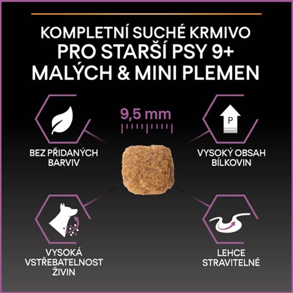 Pro Plan Small & Mini Adult 9+ Age Defence je kompletní krmivo s kvalitními kousky kuřecího speciálně vyvinuté pro potřeby starších psů malých a trpasličích plemen (s hmotností do 10 kg). Unikátní receptura s optimálním poměrem bílkovin a tuků pomáhá pejskům udržet skvělou kondici a vitalitu i ve starším věku. Speciální kombinace živin pomáhá bojovat se stárnutím organismu tím, že podporuje mentální zdraví psa, jeho přirozenou zvídavost, chuť ke hře a schopnost reagovat. Rostlinné oleje zlepšují pozornost a bystrost, glukosamin a omega-3 mastné kyseliny podporují pohyblivost kloubů a omega-6 mastné kyseliny společně s vitamínem A udržují zdravou kůži a lesklou srst. Vyvážený poměr minerálů a vitamín D přispívají ke zdraví zubů a dásní. Dopřejte vašemu pejskovi spokojené a zdravé stáří s krmivem Pro Plan.