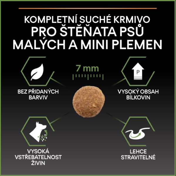 Pro Plan Small & Mini Puppy pro štěňata malých a trpasličích plemen do 12 měsíců věku. Speciální receptura obsahuje vše, co vaše štěně pro zdravý růst a vývoj potřebuje. Optimální obsah bílkovin ve formě kvalitního kuřecího, upravený obsah tuků a živiny pro správnou funkci kloubů. Krmivo je obohacené o vitamín D, minerální látky a omega-3 mastné kyseliny, které podporují zdravý stav zubů a dásní. Významnou složkou je také kolostrum, které rozvíjí a posiluje imunitní systém až o 50 % a chrání štěňata před řídkou stolicí tím, že pomáhá optimalizovat rovnováhu střevní mikroflóry. Krmivo je zároveň ideální pro březí a kojící feny.