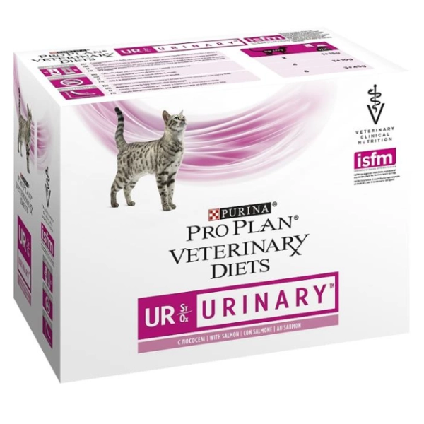 Veterinární dieta v kapsičkách Pro Plan VD Feline UR St/Ox Urinary s lososem pro kočky. Krmivo léčí onemocnění dolních močových cest. Rozpouští struvitové kameny za pomoci okyselení moči a nízké hladiny hořčíku.