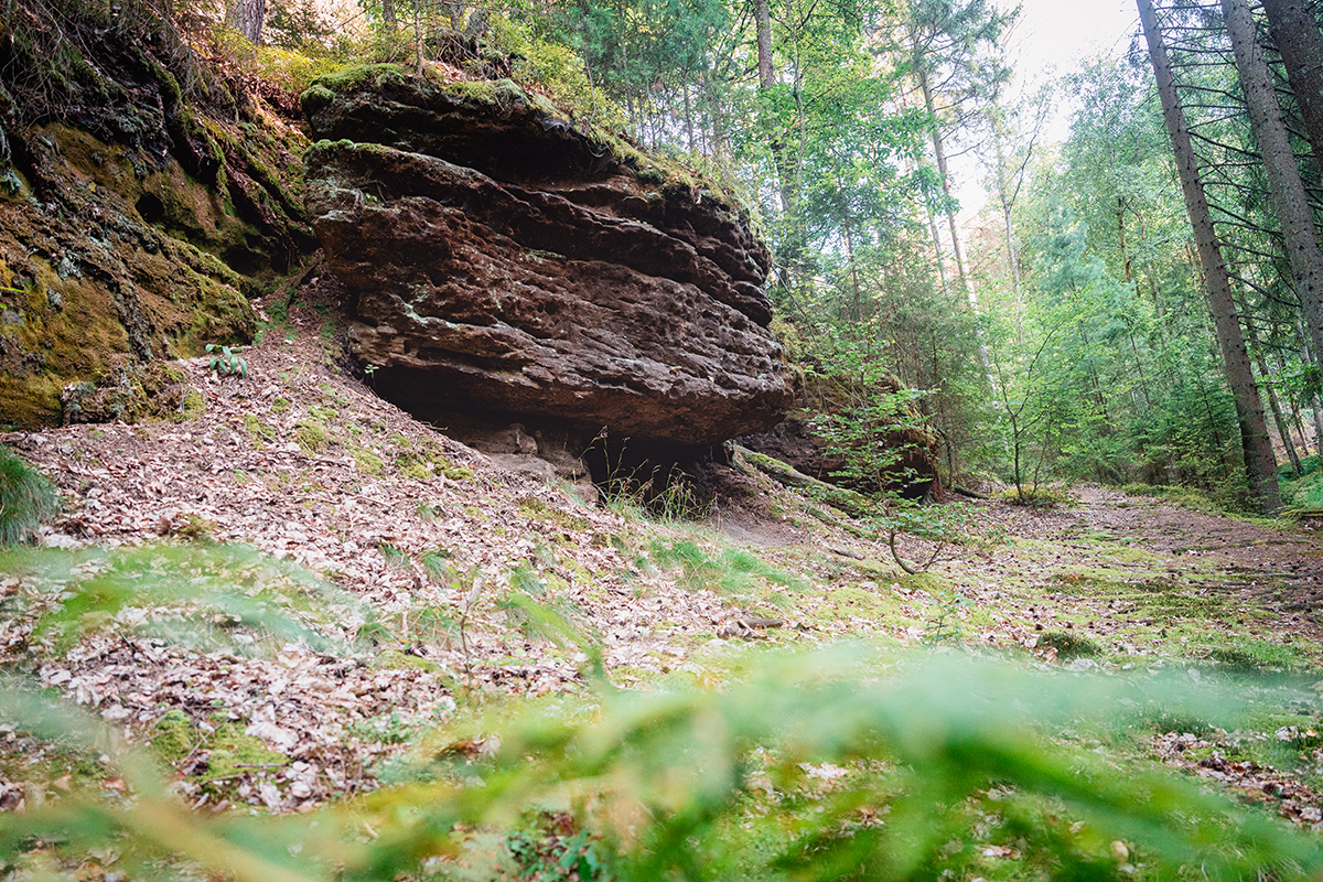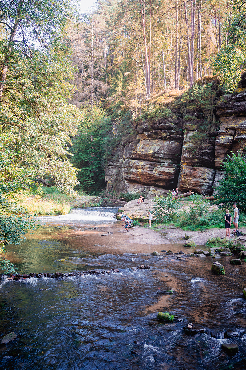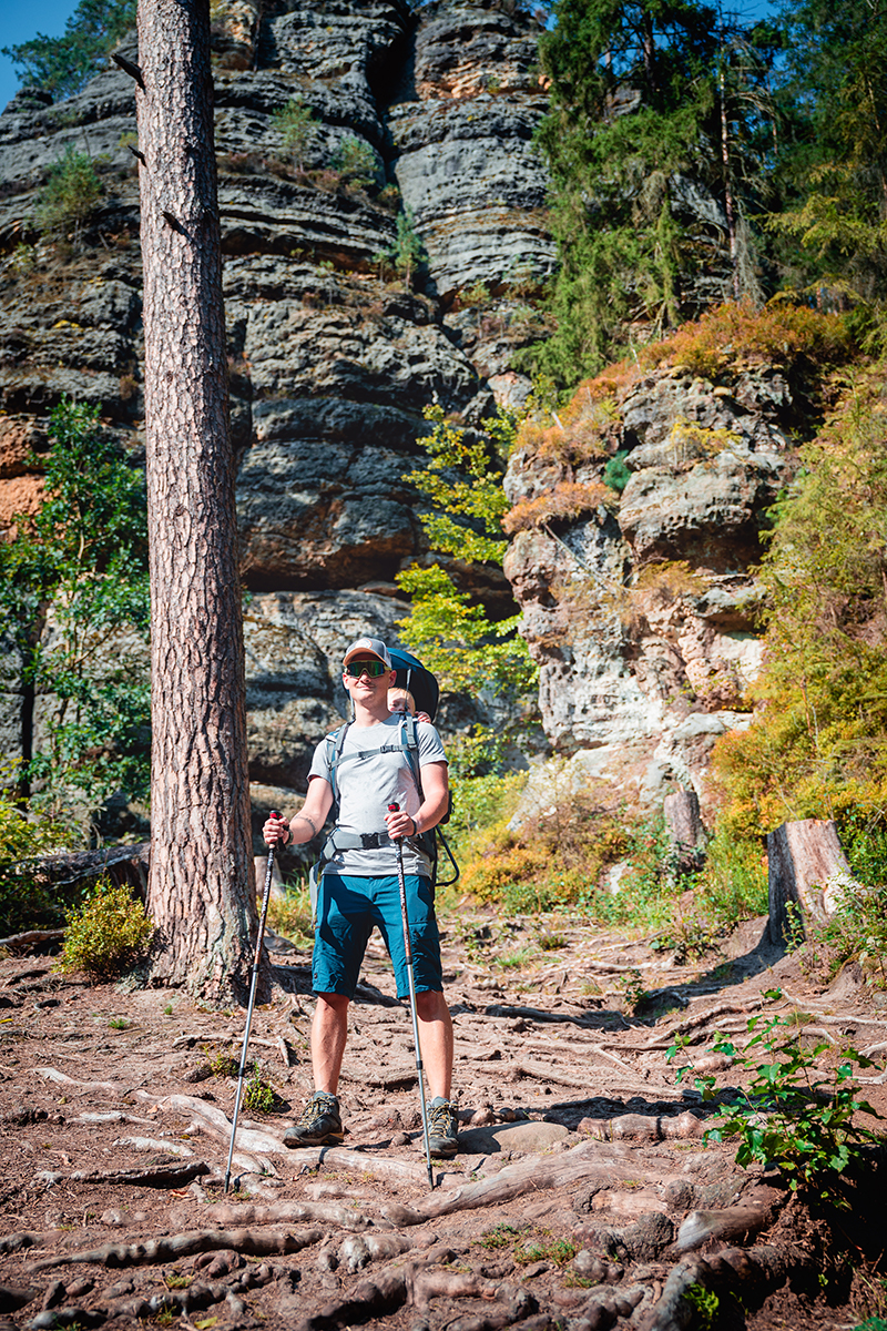 My jsme se však vydali po modré z České Lípy, která je o něco kratší, ale také náročnější. Dolů k Mlýnu vede totiž spousta schodů a zejména při zpáteční cestě se nejspíš lehce zapotíte. Sem určitě s kočárky nejezděte, my jsme měli na Víťu krosničku.