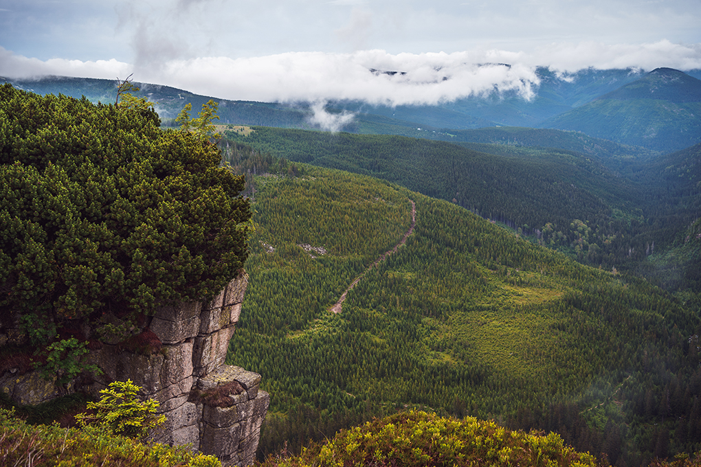A právě tady se nám otevřely první výhledy do širokého okolí, které byly, i díky odpařující se vodě z lesů, opravdu magické! Navíc byly krásně vidět i Kotelní jámy, což jsou dva ledovcové kary hory Kotel. Odtud už to bylo jen co by kamenem dohodil k Vrbatově boudě, kde se můžete občerstvit a nabrat nové síly.