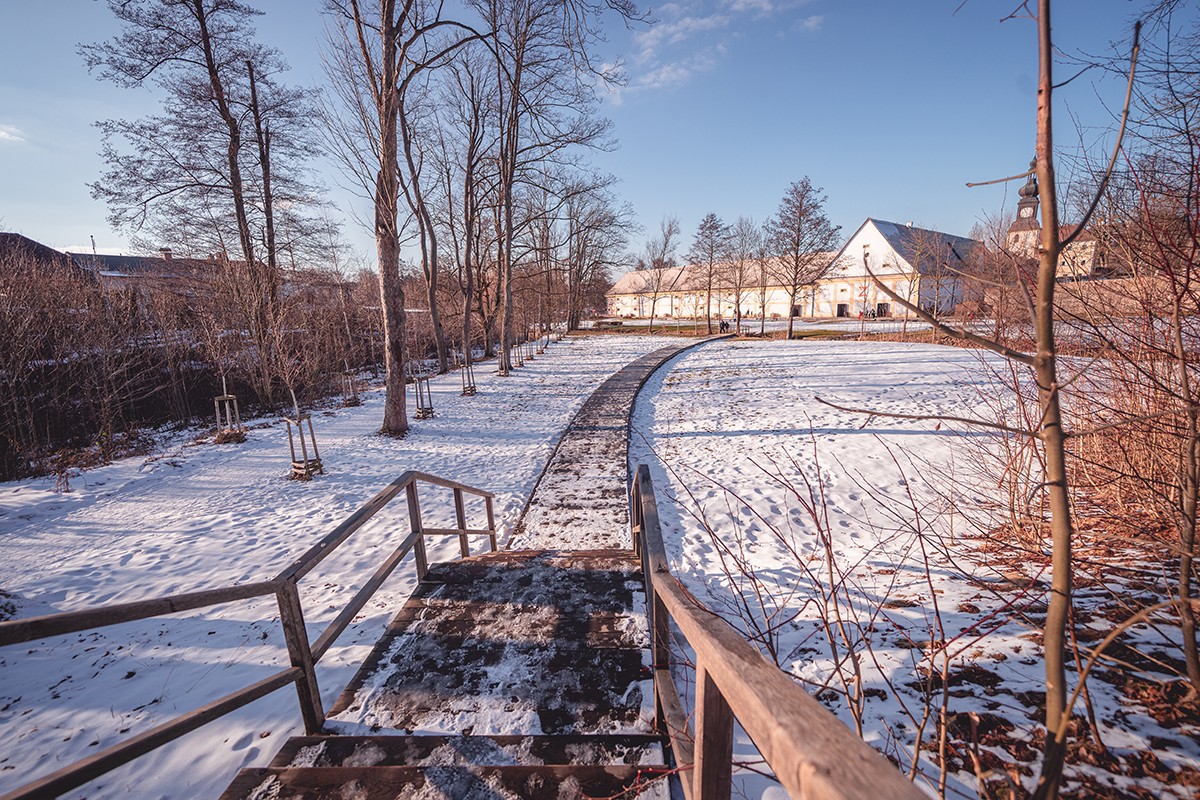 Motorového oře parkujeme na parkovišti mezi dvěma krásnými rybníky, Bránským a Konventským, odkud se přes barokní most vydáváme na vrch Zelené hory.